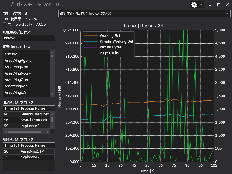 特定のプロセスを選択することで、そのプロセスのメモリ使用量やページフォルトの頻度などをグラフ化しています。