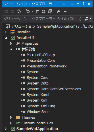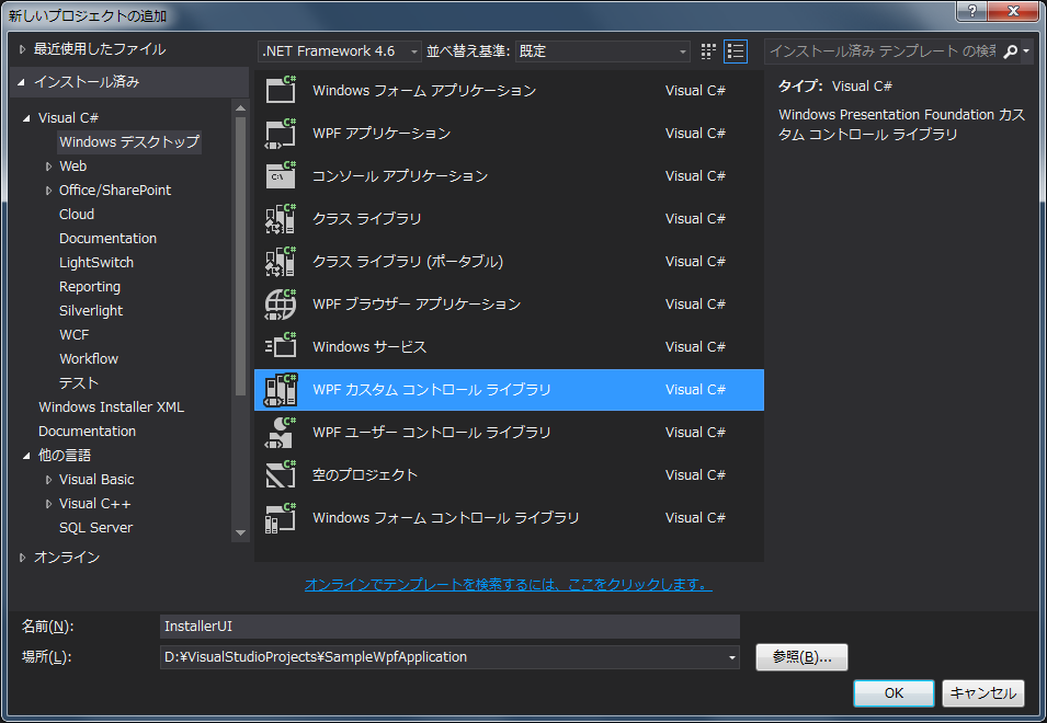 ここでは WPF カスタムコントロールライブラリのプロジェクトを "InstallerUI" という名前で追加します。