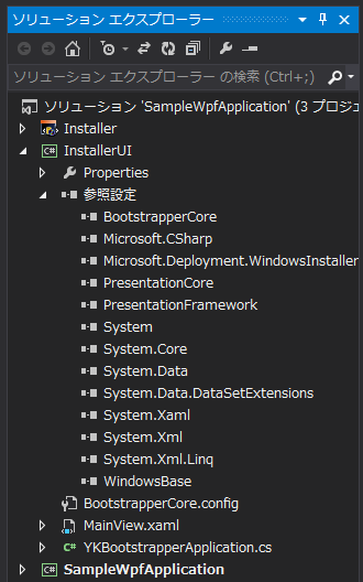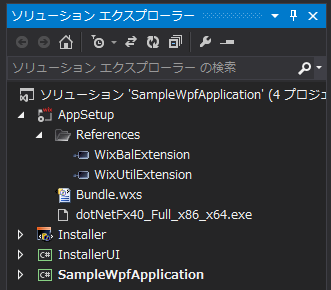 WiX の Bootstrapper Project は本来インストールさせたい SampleWpfApplication という WPF アプリケーションのインストーラパッケージである msi ファイルと、そのインストーラの UI として使用する WPF カスタムコントロールライブラリの dll を持っています。また、インストーラが必要とする .NET Framework のインストーラも持っています。