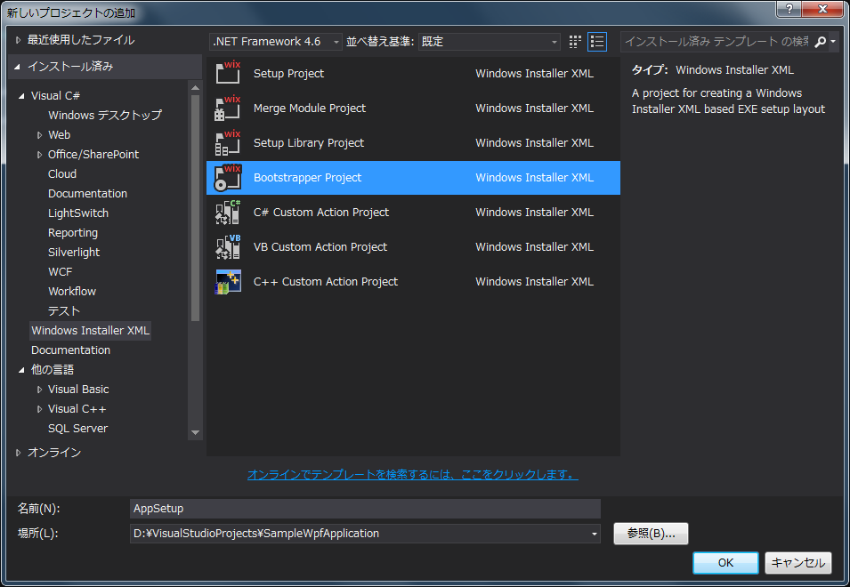 それでは、WiX の Bootstrapper Project のプロジェクトをソリューションに追加しましょう。