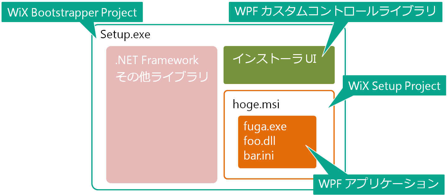WiX では Bootstrapper Project によって msi インストーラパッケージやカスタム UI の dll ファイルをすべてペイロードとして exe パッケージを作成します。