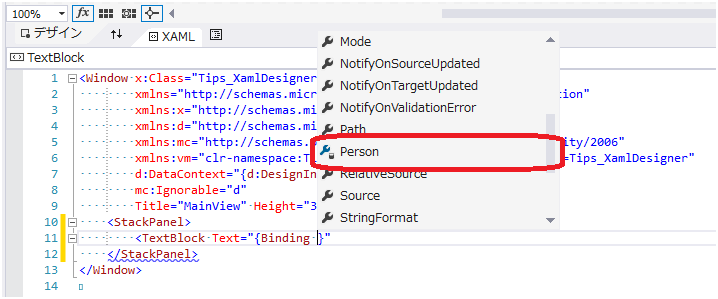 こうすることで、XAML コードを編集するとき、MainViewModel クラスのメンバも Intellisense 機能の候補に含まれるようになります。例えば、11 行目で Person プロパティを入力するとき、"Binding " まで入力するといくつか入力候補が表示されますが、その中に "Person" が含まれるようになります。