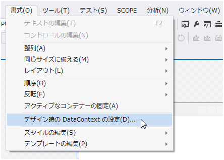 XAML デザイナー上でルート要素のウィンドウを選択した状態で、「書式」メニューの「デザイン時の DataContext の設定(D)…」という項目を選択します。