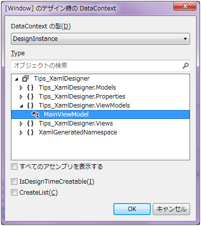 すると、次のようなダイアログが表示されるため、DataContext の型として DesignInstance を選択し、設定したい ViewModel のクラスをツリーから選択して「OK」ボタンを押します。