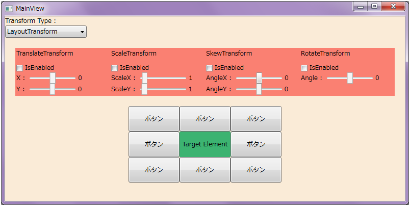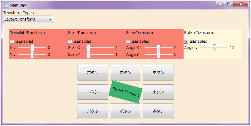 LayoutTransform プロパティを使ってコントロールを変形させた場合、レイアウトシステムがこれを認識し、関連要素を再配置します。表示結果は常に XAML に表記した通りのレイアウトになりますが、この変形をアニメーションなどで動的におこなった場合、描画処理が都度発生するため処理が比較的遅くなります。