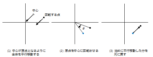ある点を中心に座標を回転させる場合は、まず中心が原点になるように全体を平行移動し、回転後に元の位置に戻すようにまた平行移動します。
