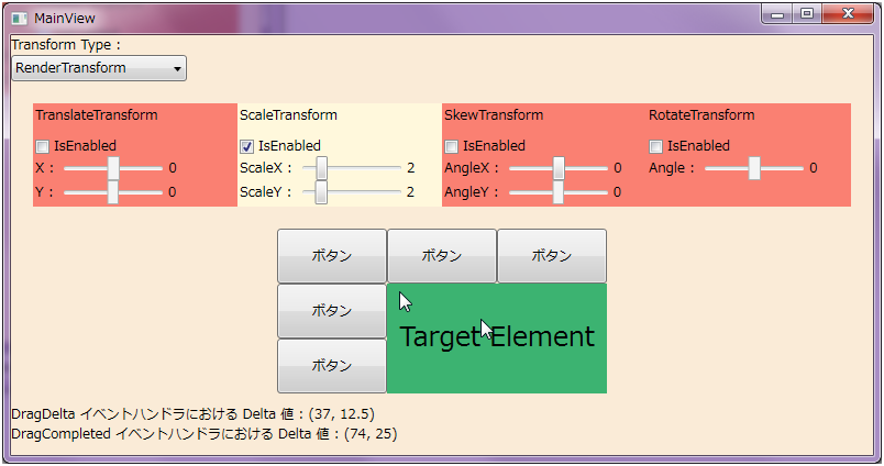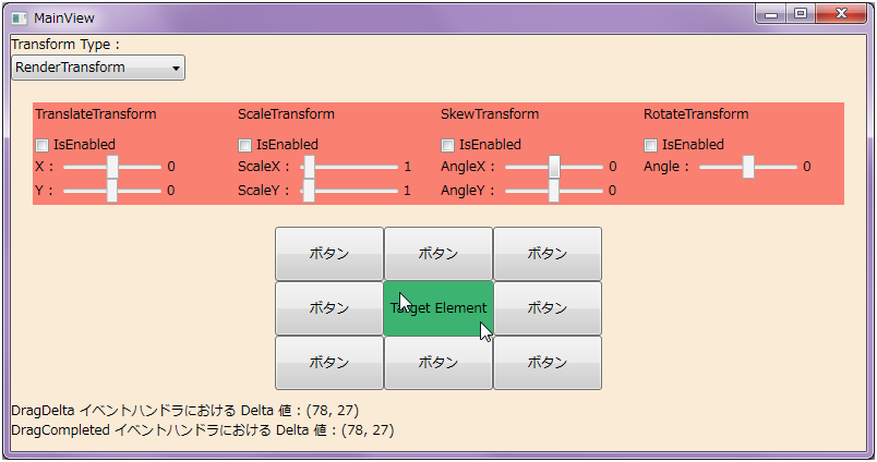 一方、どのような場合でも DragCompleted イベントハンドラで取得できるマウスの移動量はコントロールの変形によらず元の座標系での値となっています。
