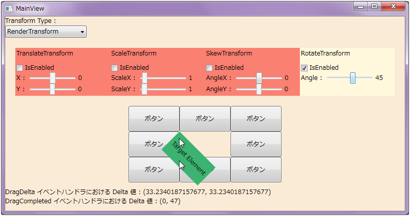 また、次の図のように回転したコントロールに対してドラッグ&ドロップ操作をおこなうと、DragDelta イベントハンドラで取得したときの移動量が回転座標系における値であることがわかります。