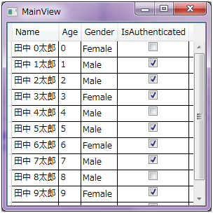 DataGrid コントロールによって People プロパティの持つ人物データコレクションが表形式で表示されることになります。ここまでのコードによる実行結果は下図のようになります。