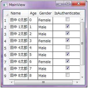 このコードの実行結果は次のようになります。DisplayRowNumber 添付プロパティに 1 を指定したため、行番号は 1 から始まっています。また、あくまでも行番号であるため、列をソートしたとしても、この番号は変わらず 1 から順に表示されるようになります。