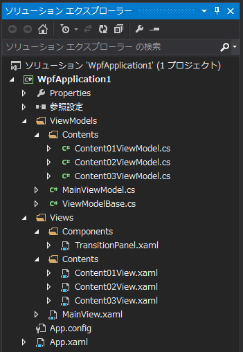 Views フォルダに MainView を始め、前回作成した TransitionPanel と、コンテンツとして表示する Content01View、Content02View、Content03View というユーザコントロールがあります。