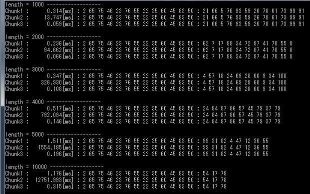 Chunk1<T>() 拡張メソッドは GroupBy() 拡張メソッドを利用したスマートな方法です。Select() 拡張メソッドで 2 回射影をおこなってはいますが、処理時間のオーダーとしては O(n) になっています。GroupBy() 拡張メソッドもハッシュ値による処理をおこなっているため、それほど遅くはならないという予測です。