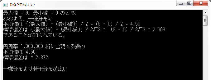 Console.WriteLine("標準偏差は {(最大値) - (最小値)} / 2√3 = (9 - 0) / 2√3 = " + (9 / 2 / Math.Sqrt(3.0)).ToString("#0.000"));