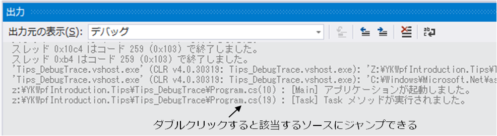 System.Diagnostics.Debug クラスや System.Diagnostics.Trace クラスを使用することで出力ウィンドウに文字列を出力することができます。このとき、次のような書式で出力をおこなうことで、出力されたテキストをダブルクリックすると該当するソースコードにジャンプすることができるようになります。