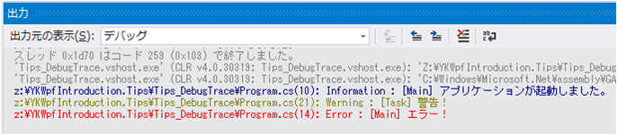 また、VSColorOutput などの拡張機能によって出力ウィンドウに表示されるテキストに色を付けている場合、Information や Error といったキーワードを含むことでさらにわかりやすいメッセージとなります。
