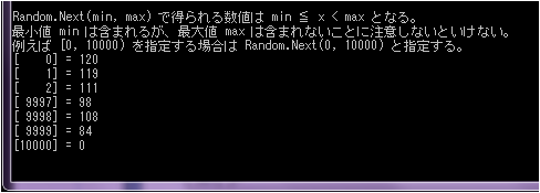 このコード例では 0 から 10000 までの範囲を指定していますが、数式で書くと 0 ≦ x < 10000 というように、最大値は含まれないことになります。もし 10000 も乱数として発生させたい場合は Next(0, 10001) というように書かなければいけません。