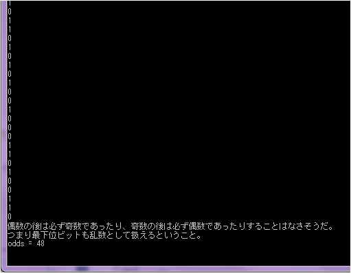 乱数発生のアルゴリズムによっては、偶数と奇数が必ず交互に現れてしまうものもあります。そうしたとき、最下位ビットは必ず 0 と 1 が交互になるため、乱数として扱うことができません。System.Random クラスの最下位ビットが乱数として扱えるかどうかを確認してみましょう。