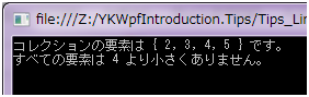 Console.WriteLine("すべての要素は " + value.ToString() + " より" + (isOk ? "小さいです。" : "小さくありません。"));