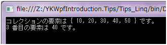 配列などと同じく、インデックス番号は 0 を先頭としているため、上記の例では 3 番目の要素は 40 となります。また、ElementAt 拡張メソッドでは、存在しないインデックス番号を指定すると実行時に ArgumentOutOfRangeException が発生します。