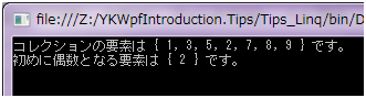 これだけだと ElementAt 拡張メソッドで 0 番目の要素を取り出す処理とほとんど変わりませんが、First 拡張メソッドは次のような条件を付けることができます。