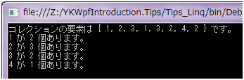 {Console.WriteLine(group.Key + " が " + group.Count() + " 個あります。");