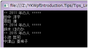 {Console.WriteLine("== {0} 年の人 =====", group.Key);