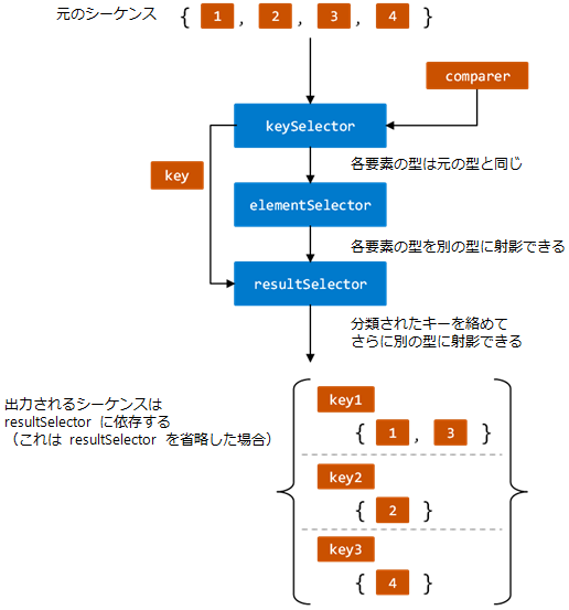入力引数にはそれぞれ keySelector、elementSeoector、resultSelector、comparer という名前が付いており、それぞれの処理は次のような順序になります。