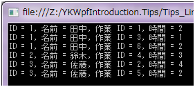 {Console.WriteLine("ID = " + t.ID + ", 名前 = " + t.Name + ", 作業 ID = " + t.TaskID + ", 時間 = " + t.Quantity);