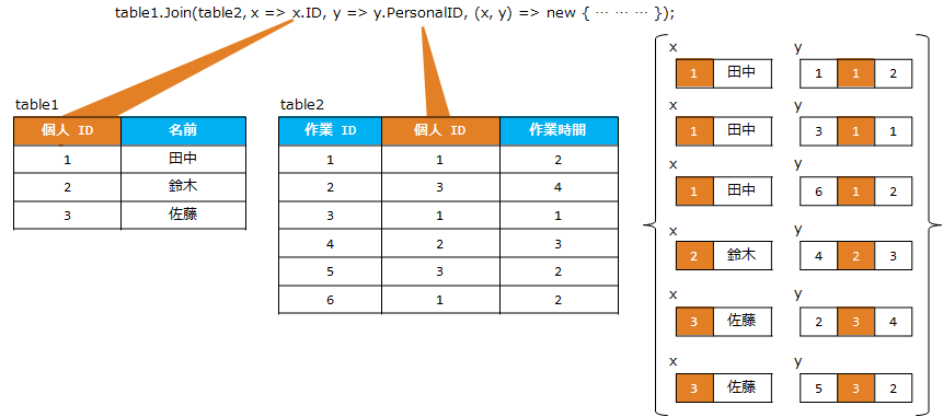 このように Join 拡張メソッドを使うことで、元となる個人別テーブルの情報と、関連テーブルである作業別テーブルを連結して別のテーブルを生成することができます。入力引数ごとに詳しく見ていきましょう。