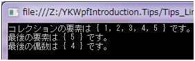 Console.WriteLine("最後の要素は {{ {0} }} です。", last);