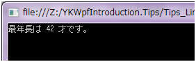 Console.WriteLine("最年長は {0} さん ({1}) です。", max.Name, max.Age);