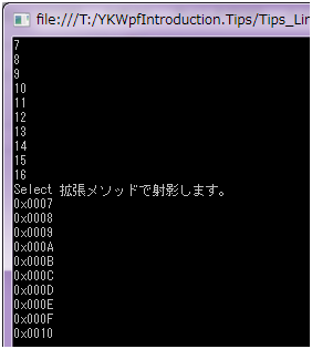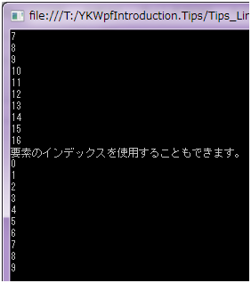 入力引数として指定するデリゲートに、入力引数を 2 つ持つデリゲートを指定することで、その 2 番目の引数が要素のインデックスとなります。上記のコード例ではそのインデックスそのものを新たなシーケンスの要素としているため、0 を先頭としてインクリメントされている様子がわかります。