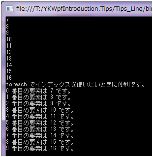 Console.WriteLine("foreach でインデックスを使いたいときに便利です。");