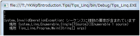 // シーケンスに要素が複数あるため例外が発生するConsole.WriteLine(numbers.Single());